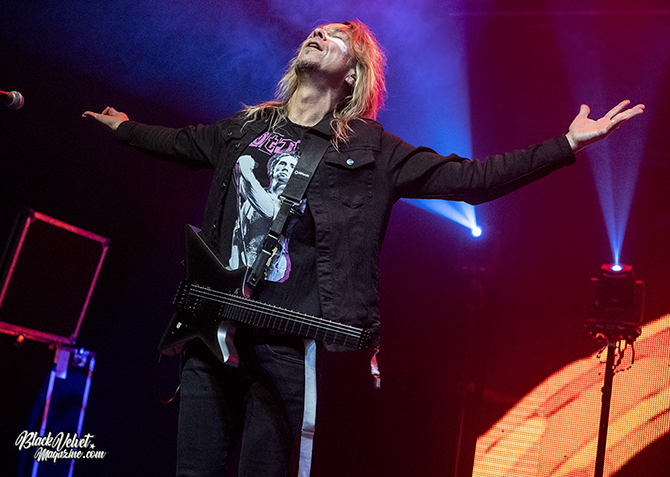 Many bands call themselves rock, but Fozzy really epitomise that. Fronted by renowned wrestler Chris Jericho, and the brainchild of guitarist Rich Ward, Fozzy come armed with heavy-duty tunes in the form of ‘Bad Tattoo’, ‘Painless’ and ‘Lights Go Out’. They use CO2 jets and sparkular special effects to add to their show, with Chris picking up his infamous CO2 gun to spray over the crowd during ‘Do You Wanna Start A War?’ Their cover of Frankie Goes To Hollywood’s ‘Relax’ is a pumping tour de force; Chris comments that it’s the first time he’s seen a moshpit for Frankie Goes To Hollywood. He gets the crowd to chant ‘Fozzy Friday’, although the audience at KK’s Steel Mill don’t seem used to chanting. “You can chant whatever you want tonight, it’s a rock ‘n’ roll party,” says Chris. He puts his hand behind his ear in between some songs, waiting for the crowd to chant, but they generally just clap or cheer, appearing a little more reserved. Maybe tonight’s Fozzy crowd is just full of rock fans rather than wrestling fans, unlike Birmingham on the band’s last tour, where the audience enthusiastically chanted all sorts of funny slogans.