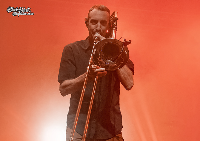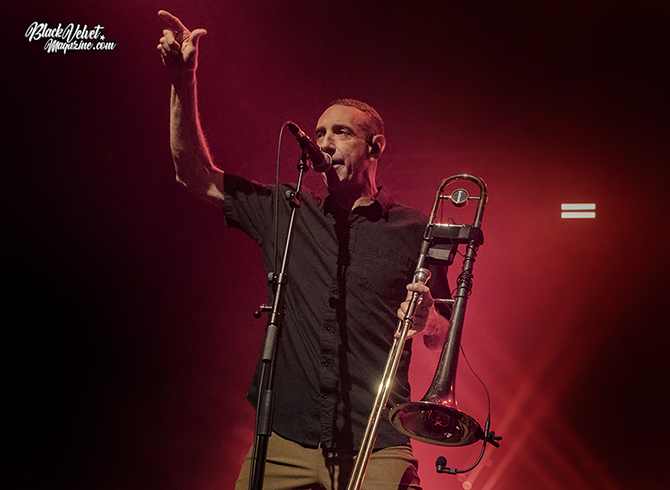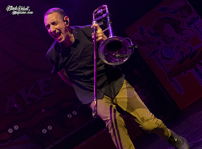 A few lines of circus theme music signal the arrival of Less Than Jake onto the stage with Buddy Schaub’s trombone notes of ‘Nervous In The Alley’ introducing the band and song. With its catchy beat and 'woah’s, you’re instantly cast into party mode. The audience sings along to the opening number and ‘History Of A Boring Town’, and there are lots of cheers at the end of each song. “You can tell we’re not in Derby anymore,” jokes Chris. The audience features all ages, showing that the band are still making new fans as well as retaining their older, long-standing ones.